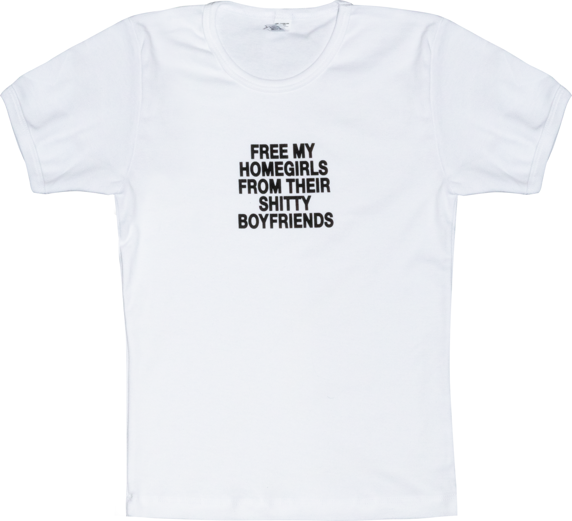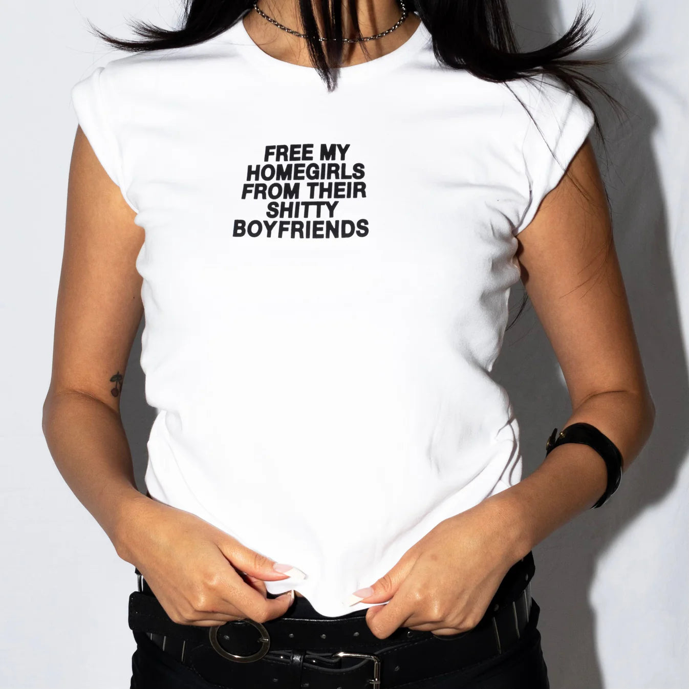baby tee with a big message: FREE MY HOMEGIRLS FROM THEIR SHITTY BOYFRIENDS.Every purchases pisses off a shitty boyfriend.